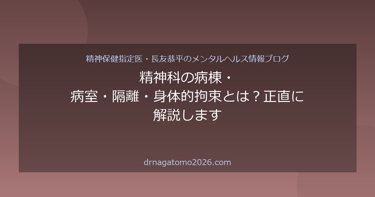 精神科病棟に関して「閉鎖されている」「隔離される」「縛られる」というイメージを持っている方は多いと思います。これらは現実に存在する措置ですが、どのような条件のもとで行われるか、患者にはどのような権利があるかを正確に理解しておくことが大切です。
